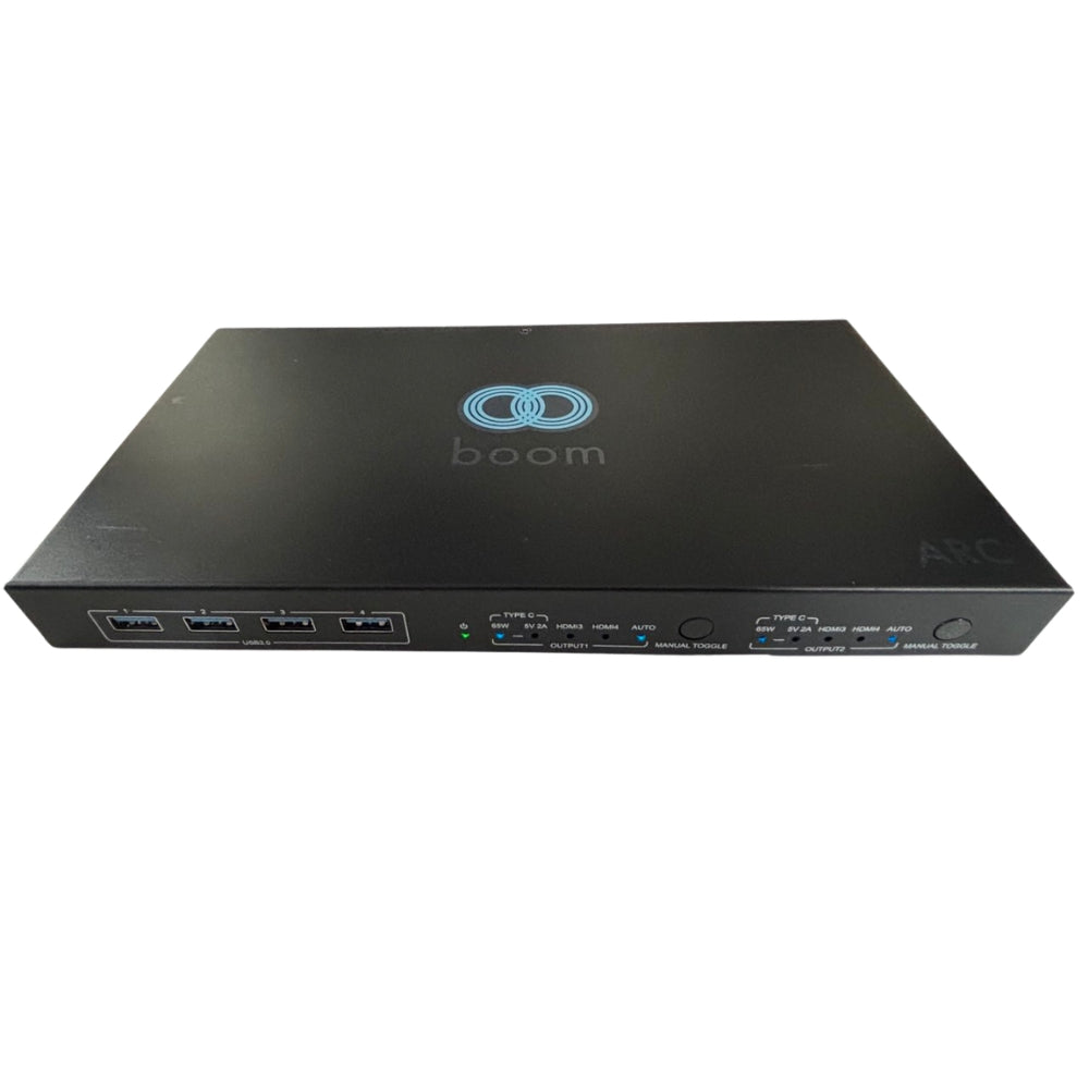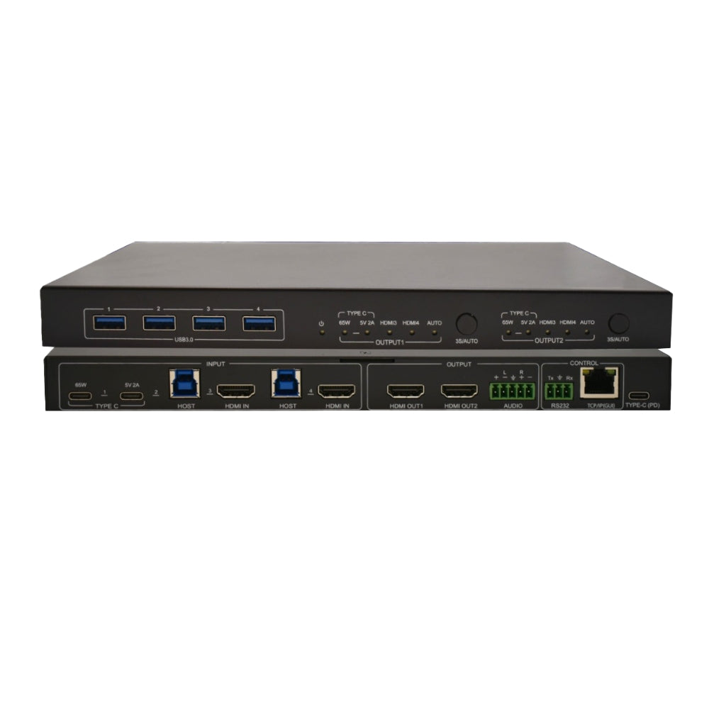 A dual-host 4K video conferencing switcher built for BYOD and hybrid meeting rooms. KVM switching, 4×2 HDMI matrix, and USB host auto-switching let two hosts share a single room display and camera setup without reconfiguring cables.
